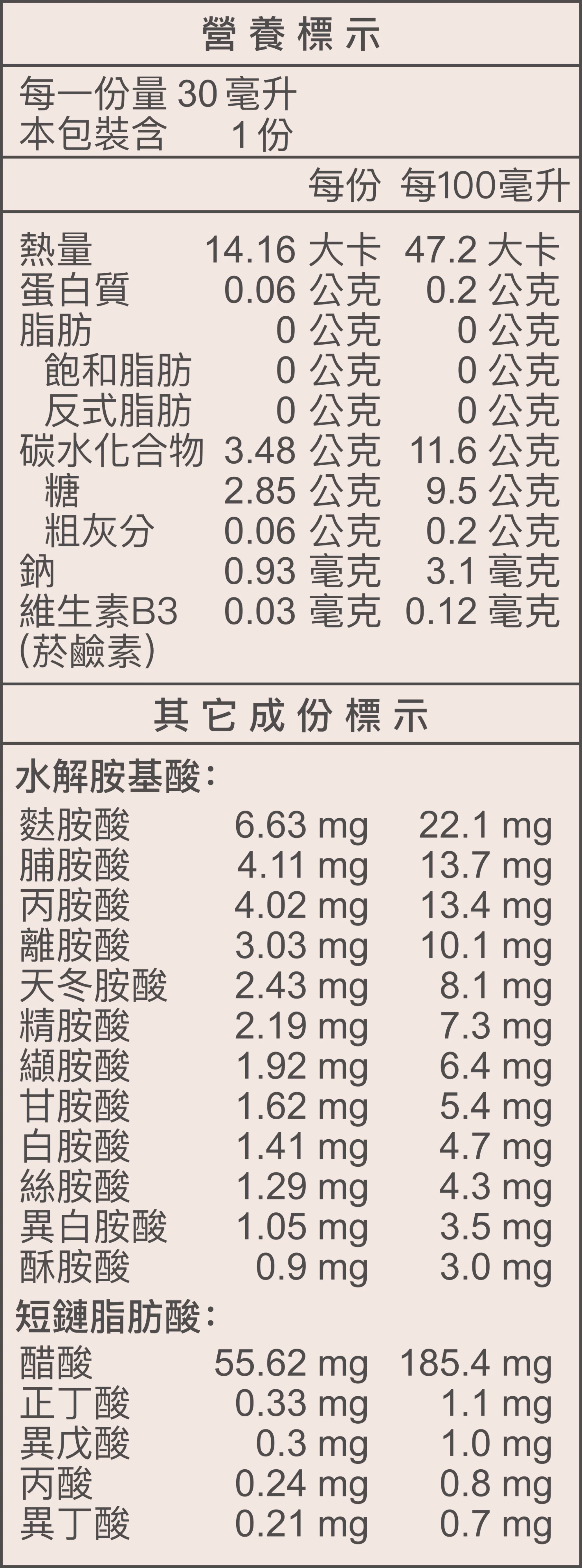 幫助維持消化道機能、改變細菌叢生態、調節生理機能、幫助牙齒骨骼正常發育、滋補強身、增強體力、養顏美容、口氣芬芳、促進新陳代謝、健康維持。 品名:元活溸®(Alive Soup®) 發酵液 (酵溸) 內容物:純水、植物皂甘、余甘子(油柑)、穀物提取物、植物提取物。 容量:30ml 使用用法: